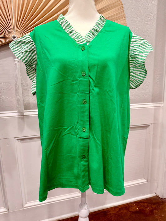 Button Front Ruffled Stripe Trim V-Neck Blouse
