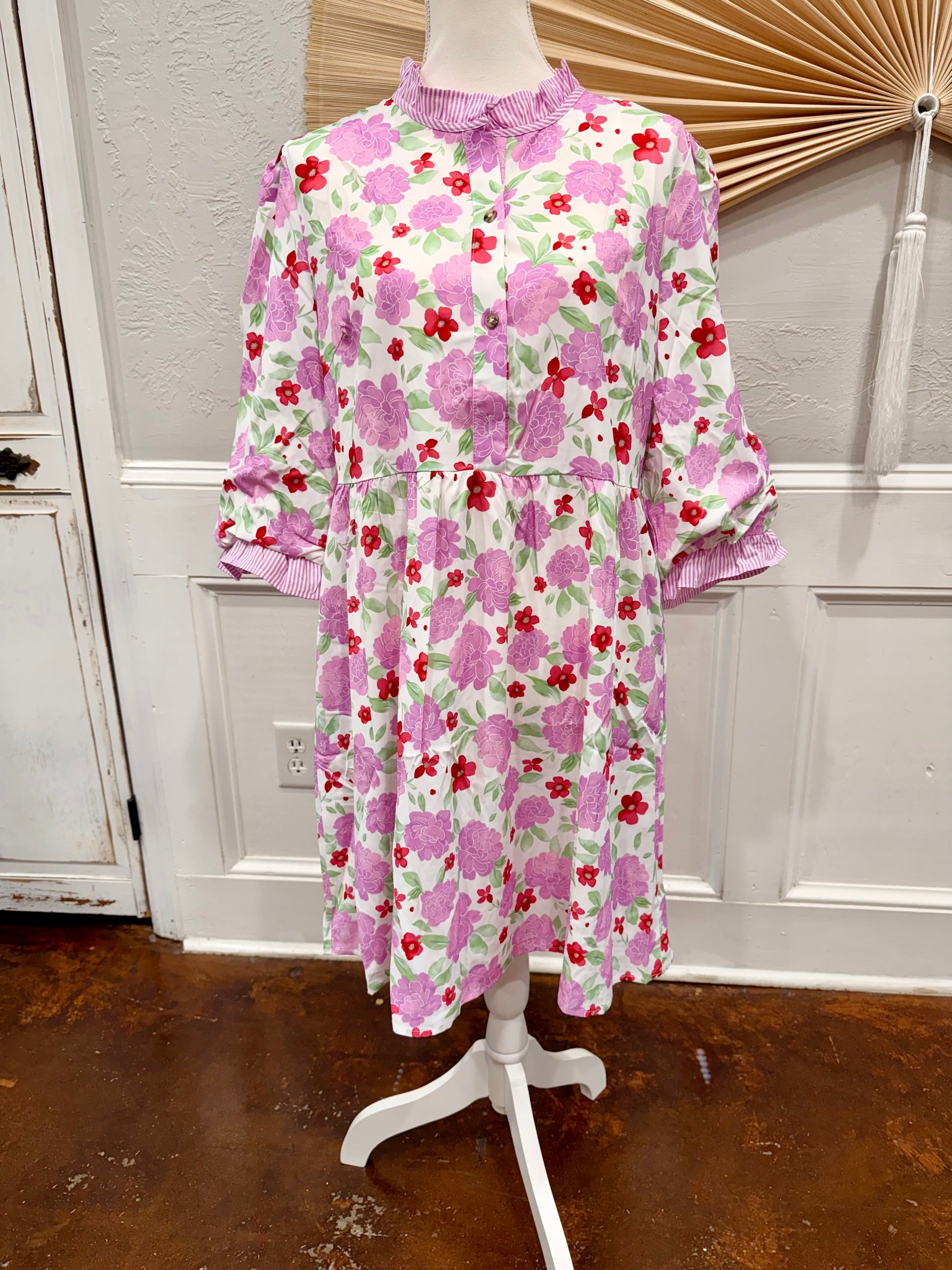 Floral print with striped trim creates a delightful contrast for visual appeal. Frilled neckline adds romantic feminine detailing to this flared mini dress. 3/4 sleeves offer elegant coverage while maintaining a breezy lightweight feel. Flared silhouette creates playful movement and universally flattering shape. 100%Polyester